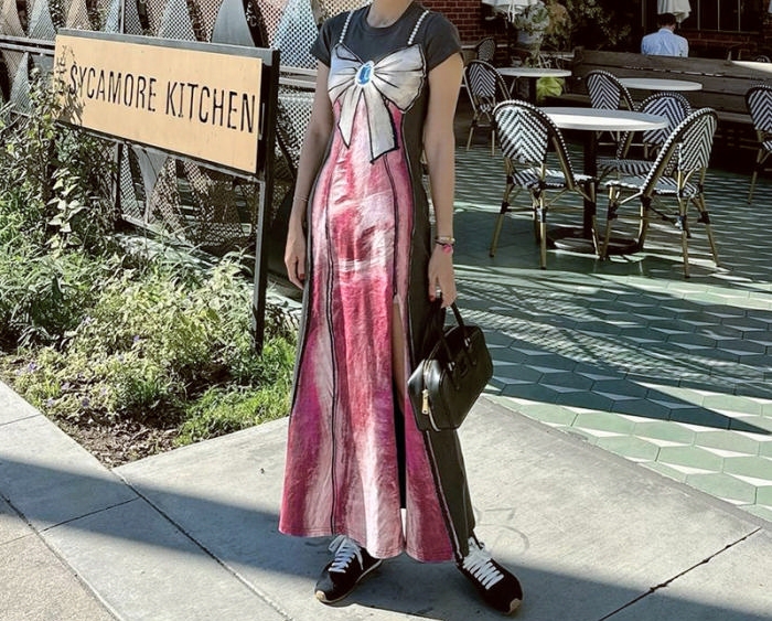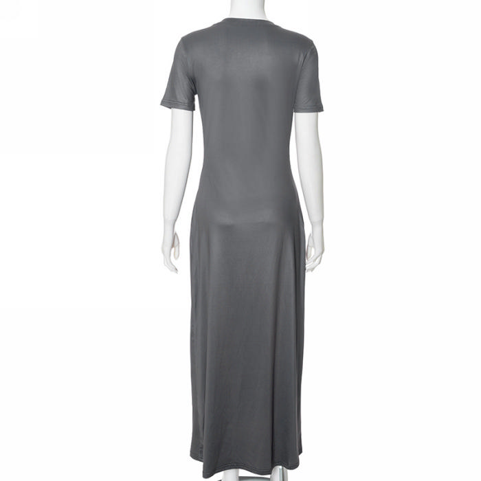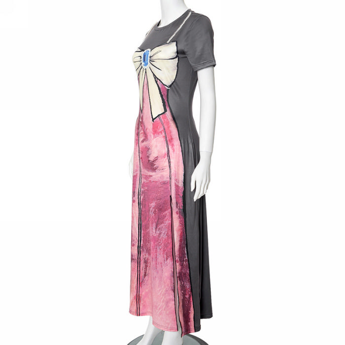 (Real Image)2024 Styles Women Fashion Pink Dress with Floral Print, Round Neck, Pearl Bead Chain and Side Split Maxi DressSKU: #CF76153-1