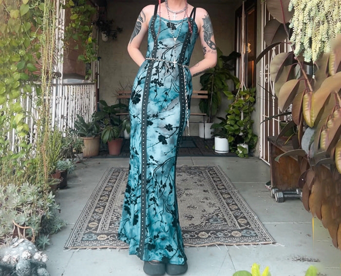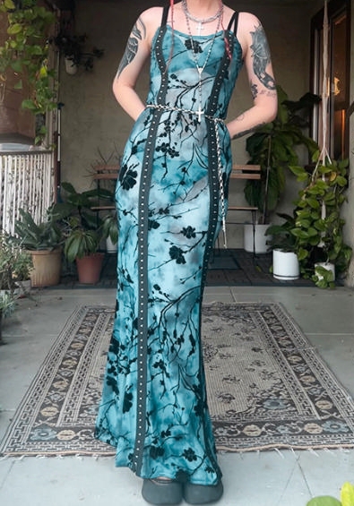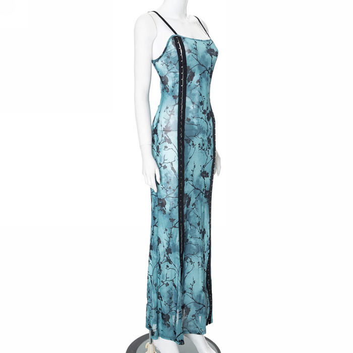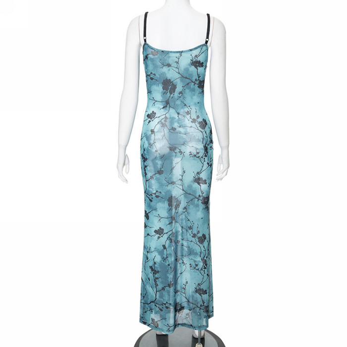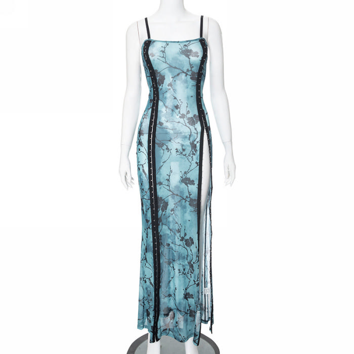 (Real Image)2024 Styles Women Fashion Print Mesh Sheer Metal Buckle High Split Halter DressSKU: #CF76164-1