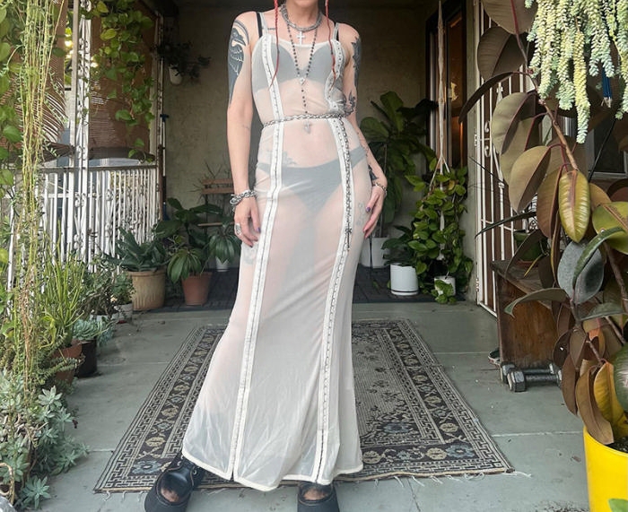 (Real Image)2024 Styles Women Fashion Print Mesh Sheer Metal Buckle High Split Halter DressSKU: #CF76164-3