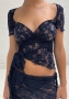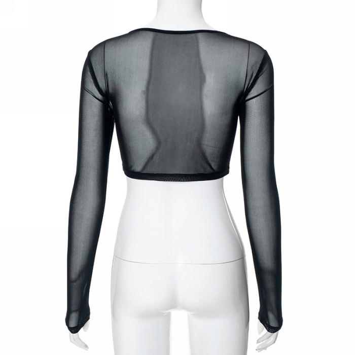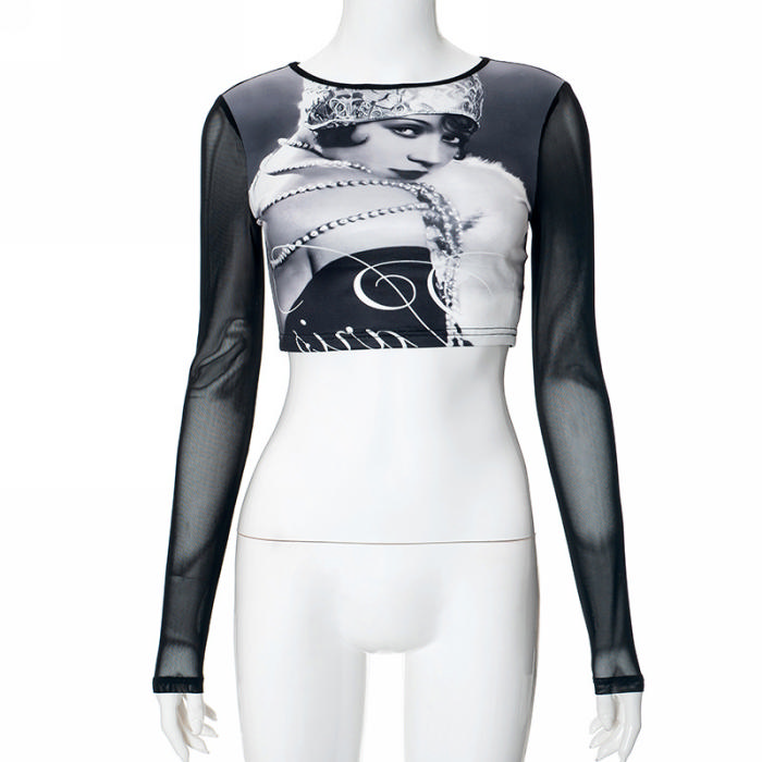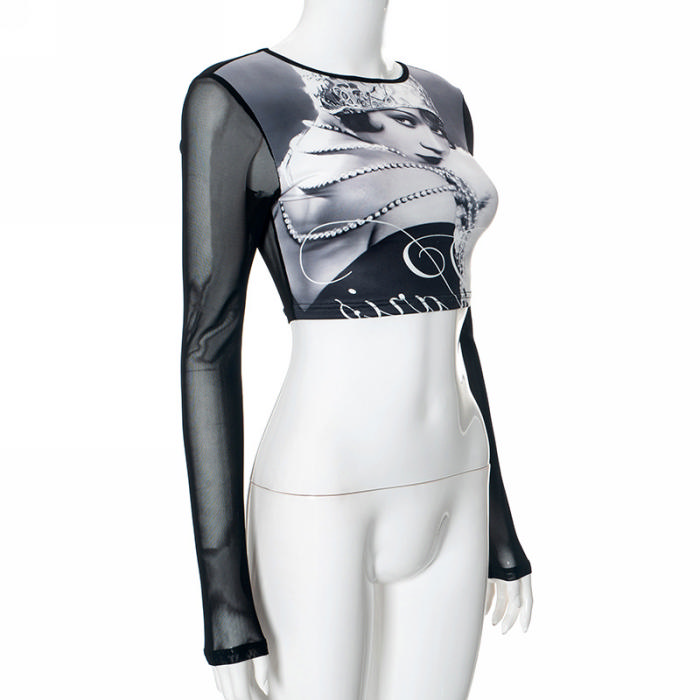 (Real Image)2024 Styles Women Fashion Vintage Beauty Print Mesh Paneled Round Neck Pullover Crop TopSKU: #CF761804-1