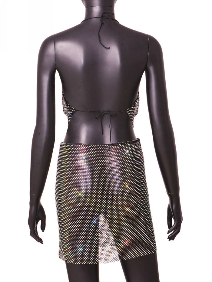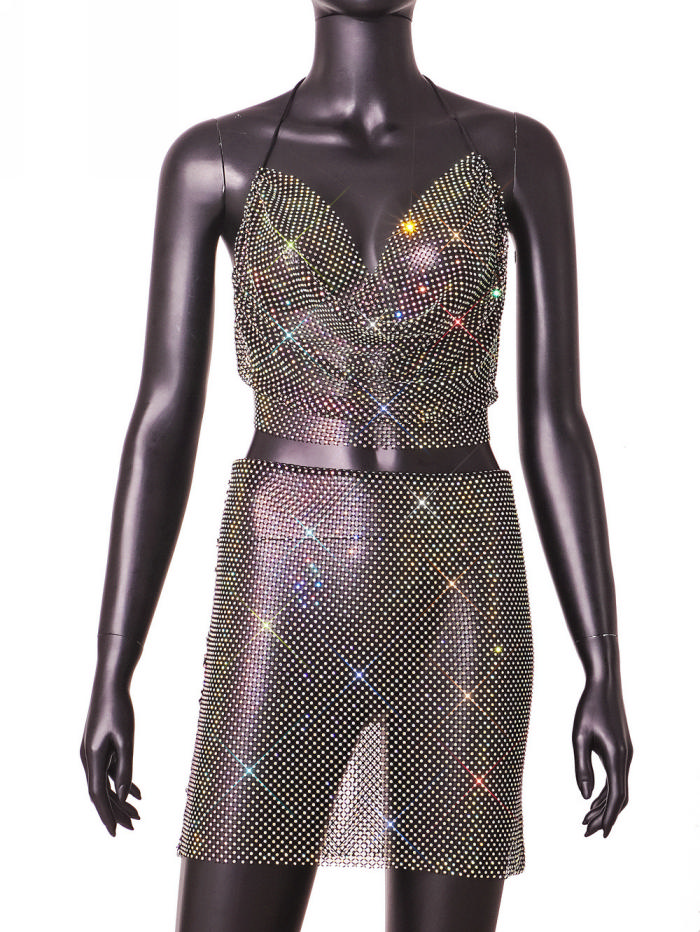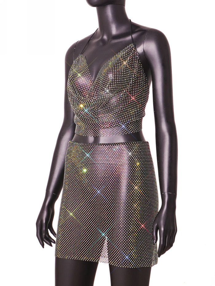 (Real Image)2024 Styles Women Fashionable Sexy Rhinestone Halter Two-piece SkirtSKU: #CF90133-1