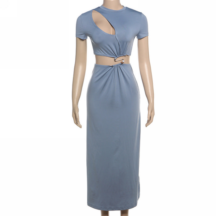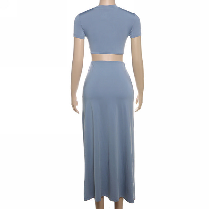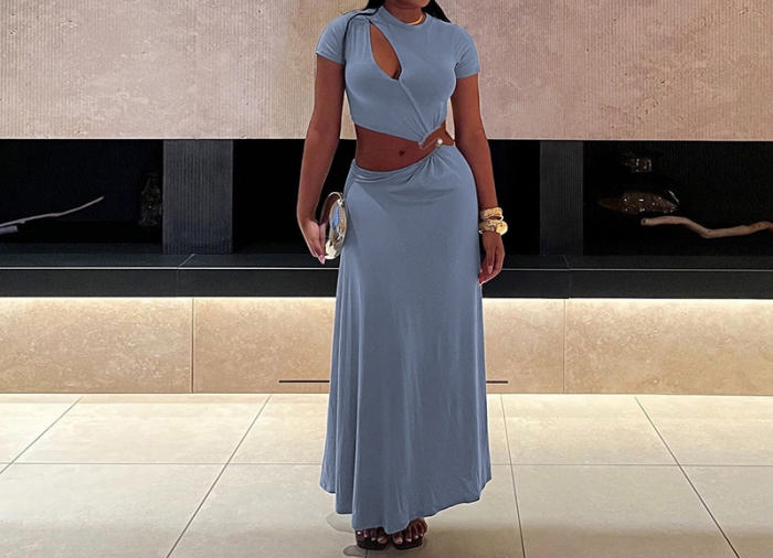(Real Image)2024 Styles Women Fashionable Sexy Short-Sleeved Round-Neck Crop Top with Openwork Long Skirt Two-Piece SetSKU: #CF83366-1