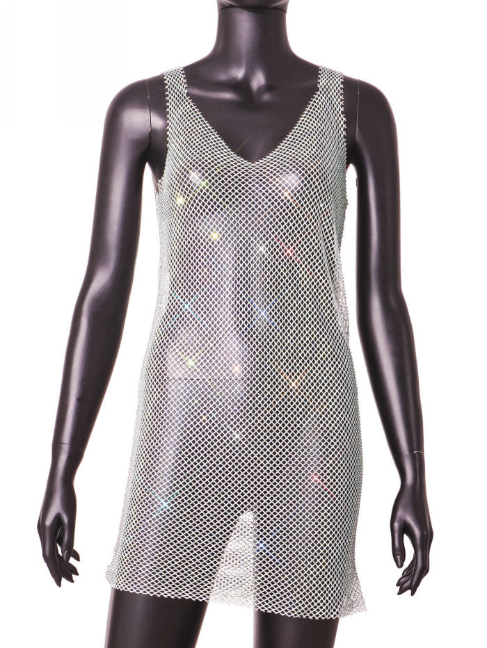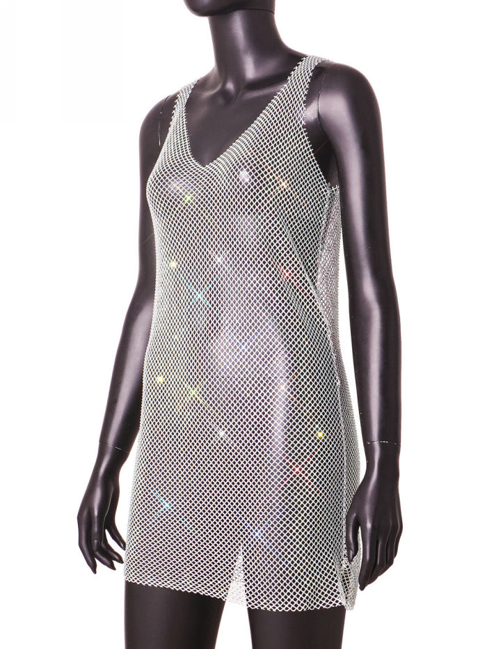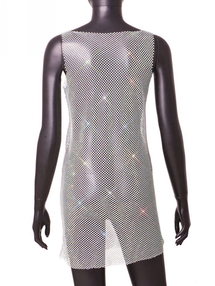 (Real Image)2024 Styles Women Fashionable Sexy Sleeveless Stretch Rhinestone Mesh See-through Crew Neck DressSKU: #CF90134-1