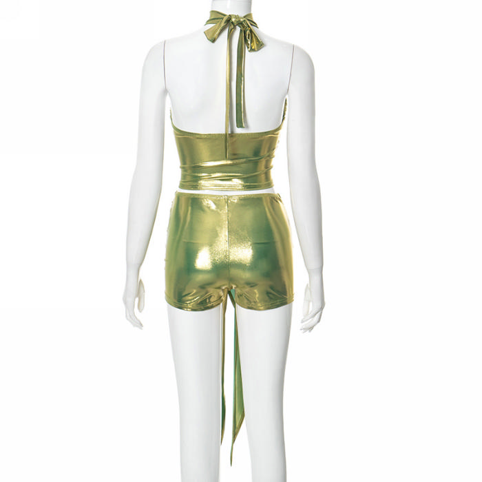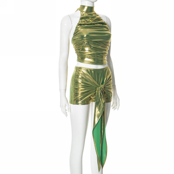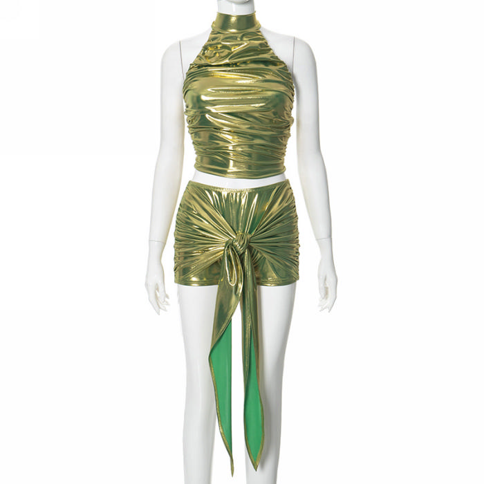 (Real Image)2024 Styles Women Faux Leather Sleeveless Vest Top with Tied Detail and Skirt SetSKU: #CF92063-1