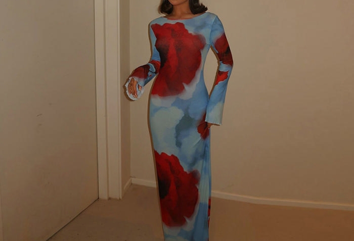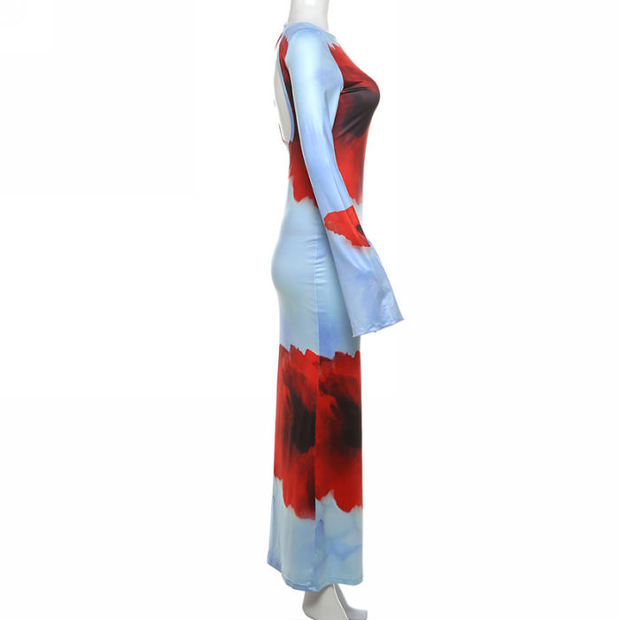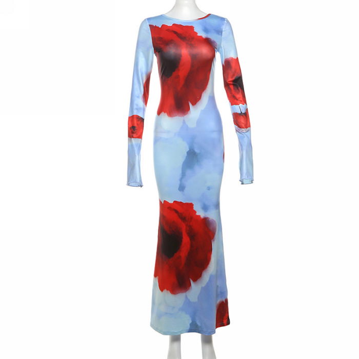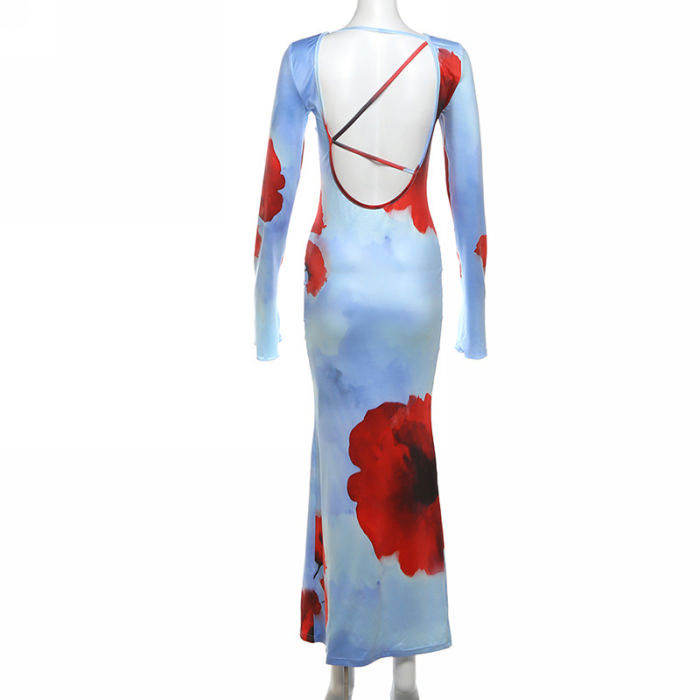 (Real Image)2024 Styles Women Floral Long Sleeve Round Neck Backless Body-Con Maxi DressSKU: #CF83384-1