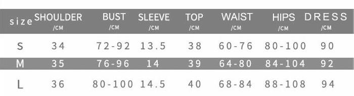 | Size | Bust | Waist | Hips |