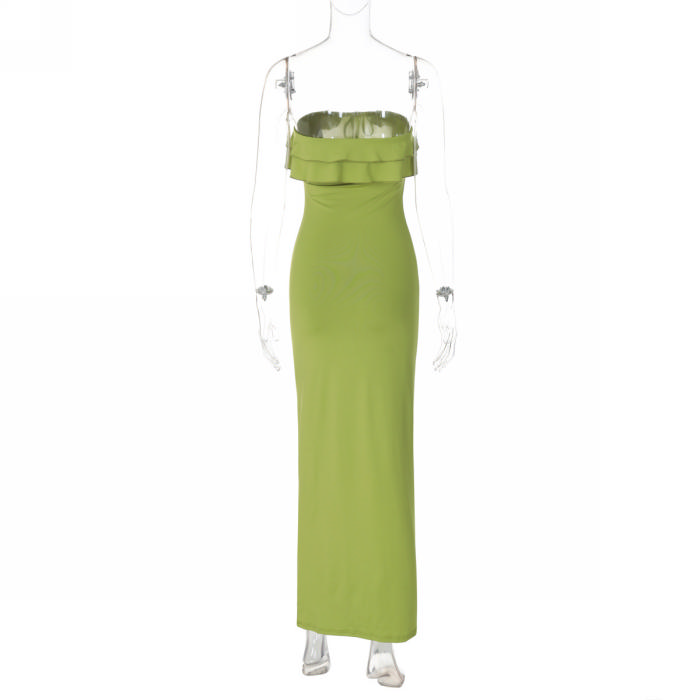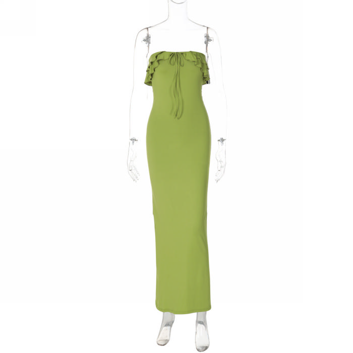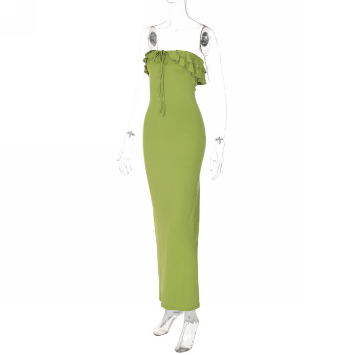 (Real Image)2024 Styles Women Halter Neck Floral Trimmed Tied-Waist Solid Color DressSKU: #CF88282-1