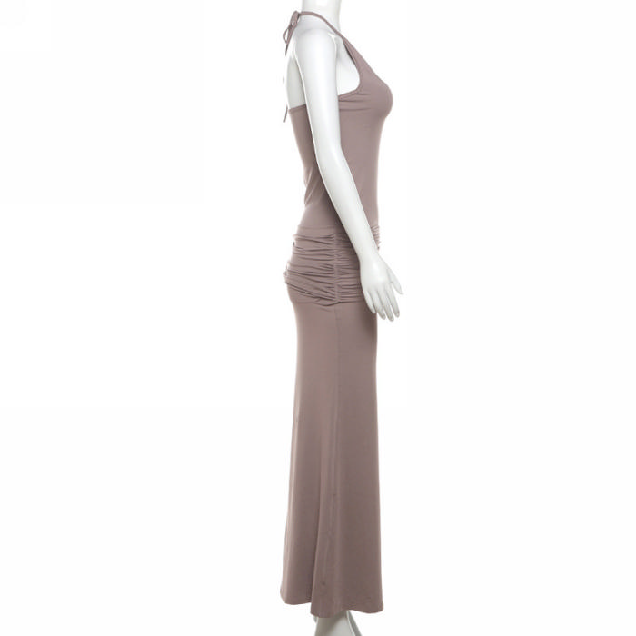 (Real Image)2024 Styles Women Halter Neck Tied-Ruffle Solid-Color Body-Con Long DressSKU: #CF83391-1