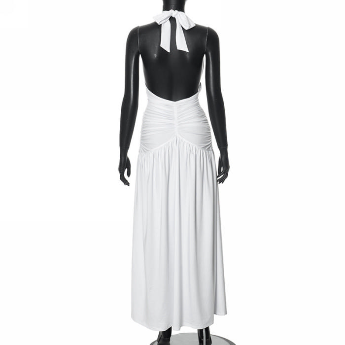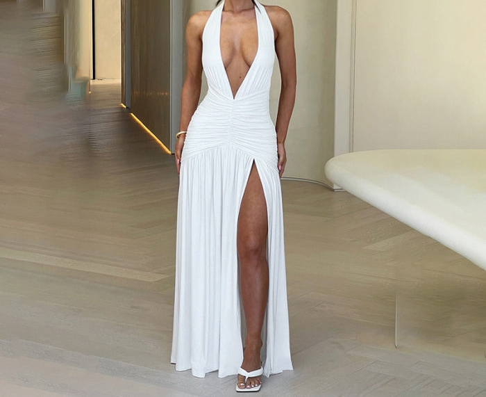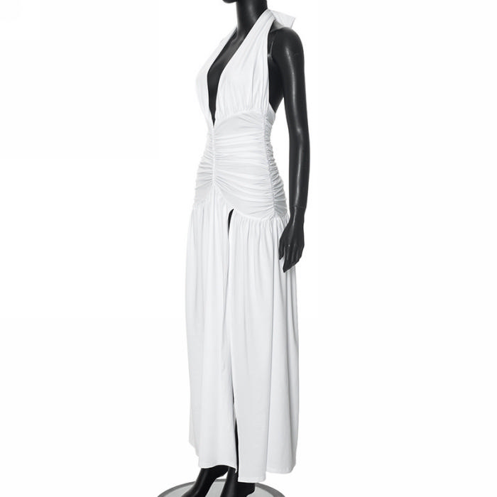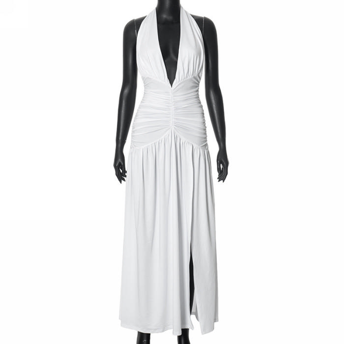 (Real Image)2024 Styles Women Halter V-Neck Lace-Up Exposed-Back Split Elegant Long DressSKU: #CF92121-1