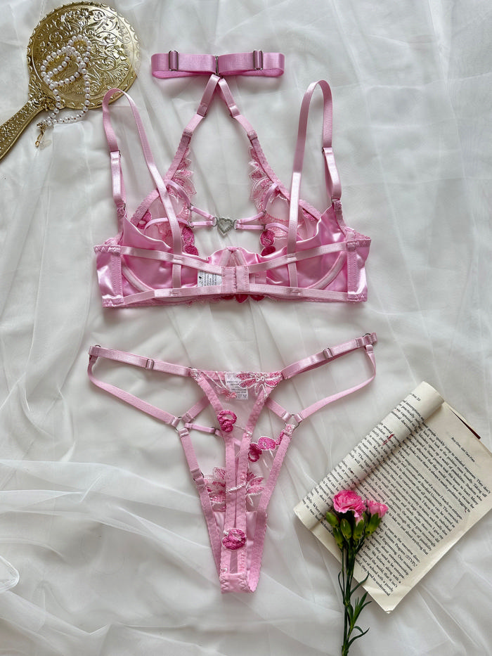 (Real Image)2024 Styles Women Heart-Shaped Rhinestone Buckle Sexy Openwork Embroidered Erotic Halter Lingerie SetSKU: #GF02034-1