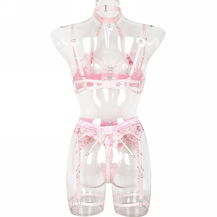 (Real Image)2024 Styles Women Heart-Shaped Rhinestone Buckle Sexy Openwork Embroidered Erotic Halter Lingerie SetSKU: #GF02033-1