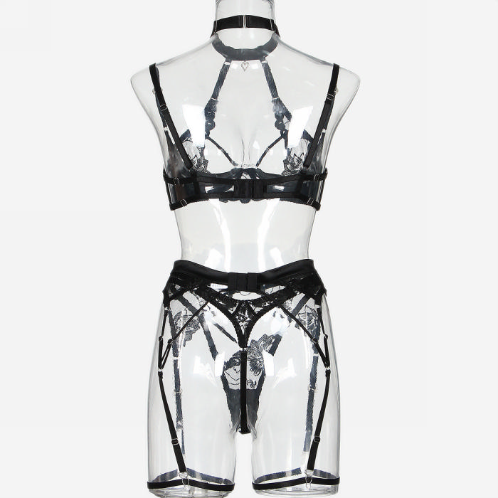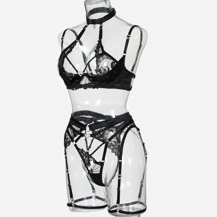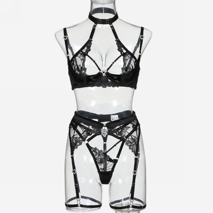 (Real Image)2024 Styles Women Heart-Shaped Rhinestone Buckle Sexy Openwork Embroidered Erotic Halter Lingerie SetSKU: #GF02033-3