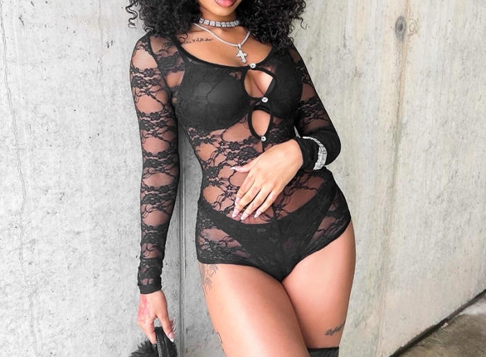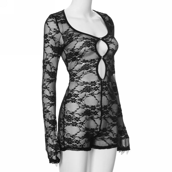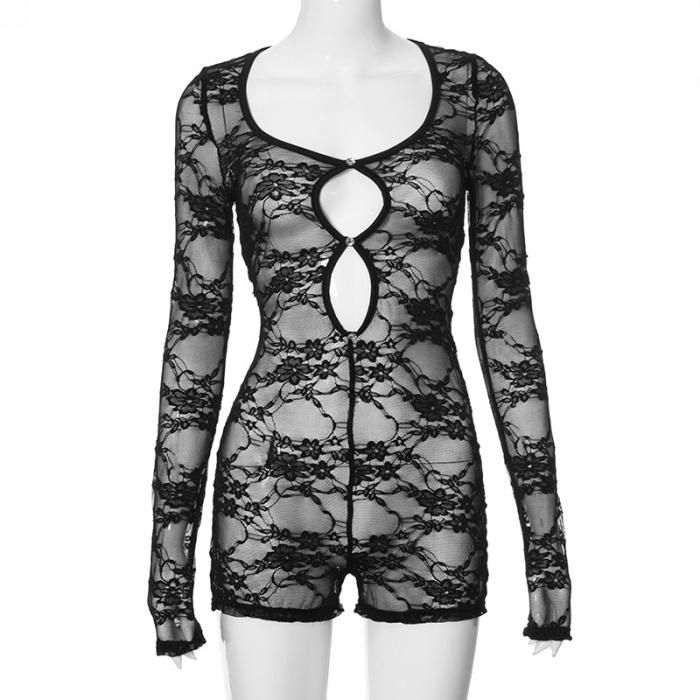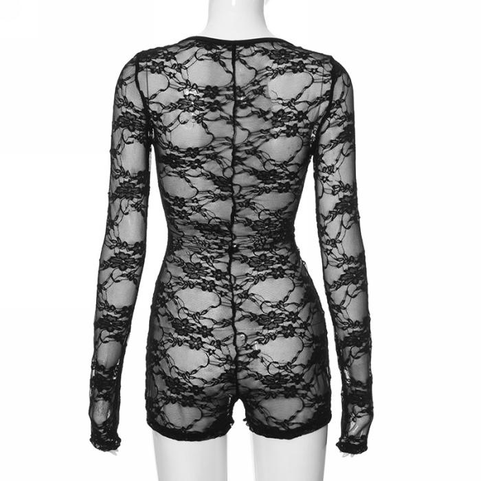 (Real Image)2024 Styles Women Lace-Trimmed Sexy Jumpsuit with Mesh See-Through DetailSKU: #CF92109-1