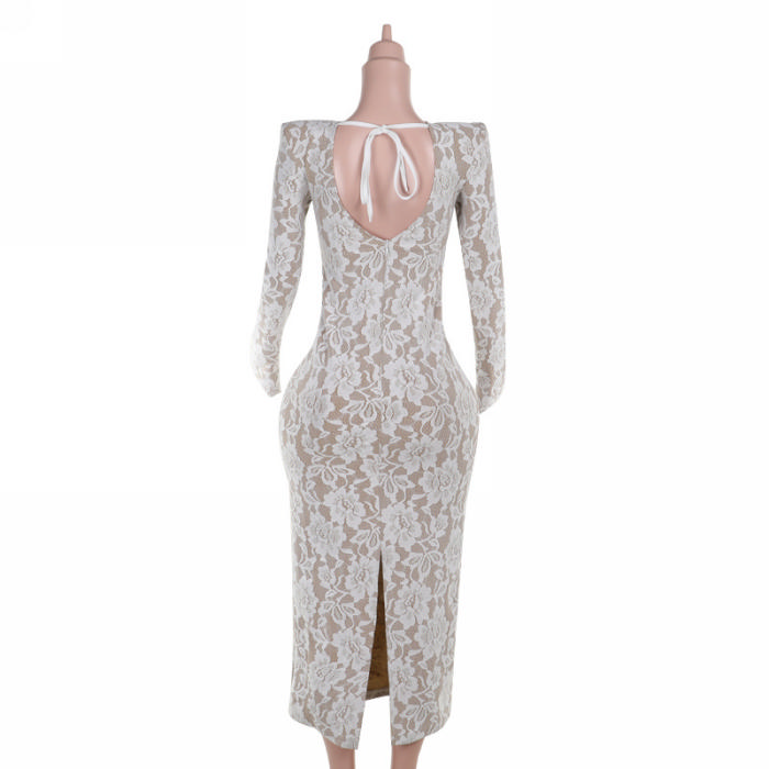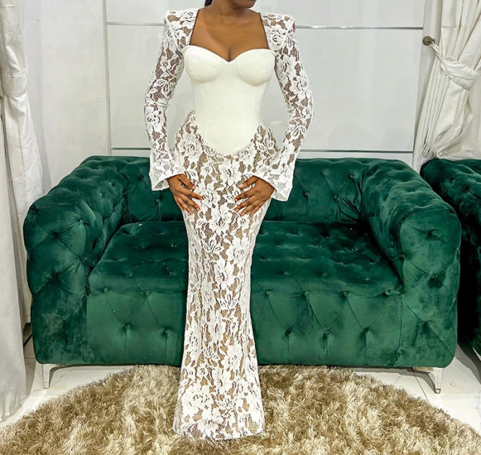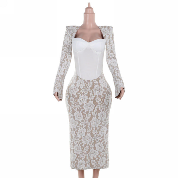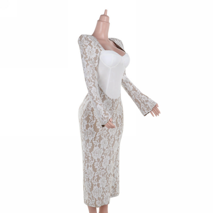 (Real Image)2024 Styles Women Lace-Trimmed Waist-Cinching Long-Sleeve Split DressSKU: #XF92920-1