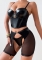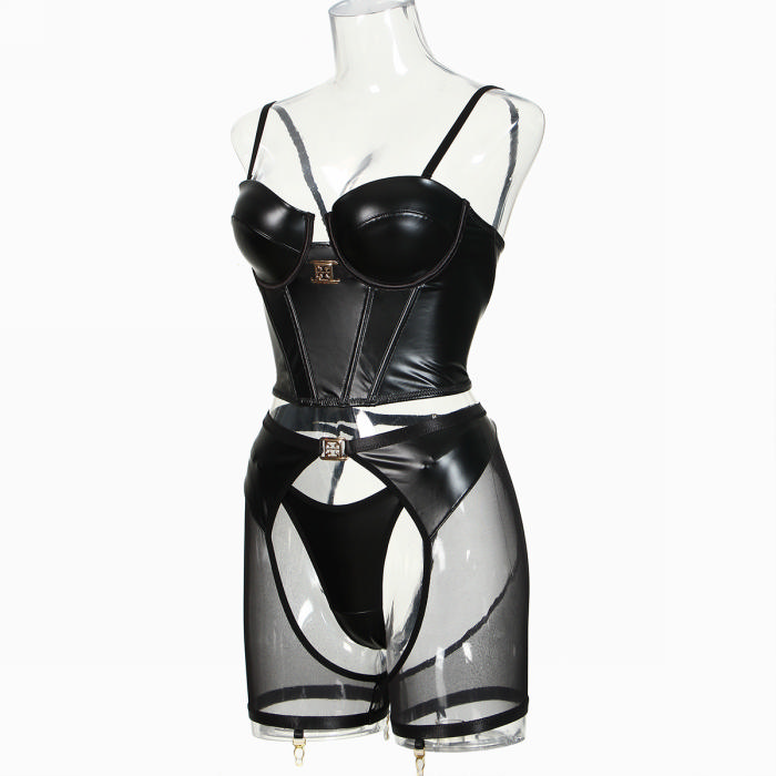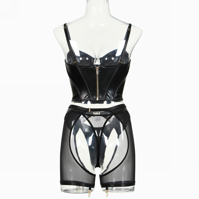 (Real Image)2024 Styles Women Leather and Fabric Shapewear Halter Bra Set with Net Mesh Erotic Three-Piece SetSKU: #GF02035-1