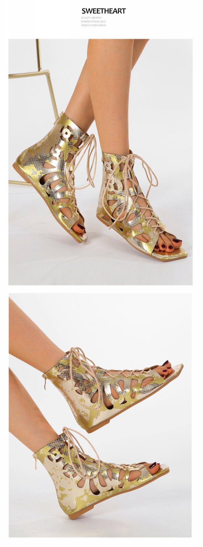 (Real Image)2024 Styles Women Luxury Lightweight Hollow-Out Gold Square-Toe Laced Roman Gladiator Flat SandalsSKU: #CF46187-2