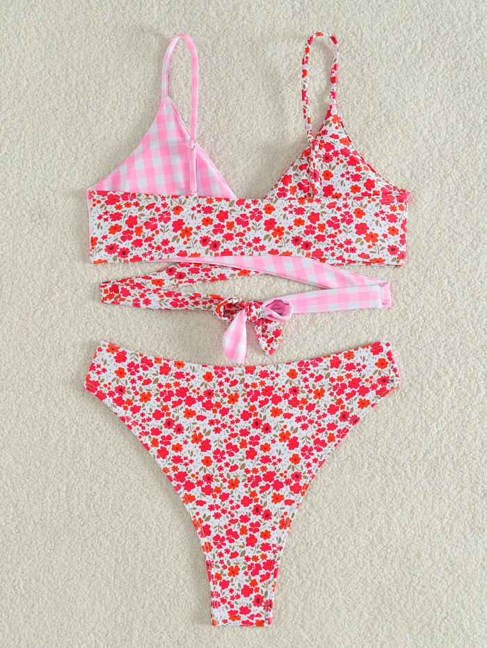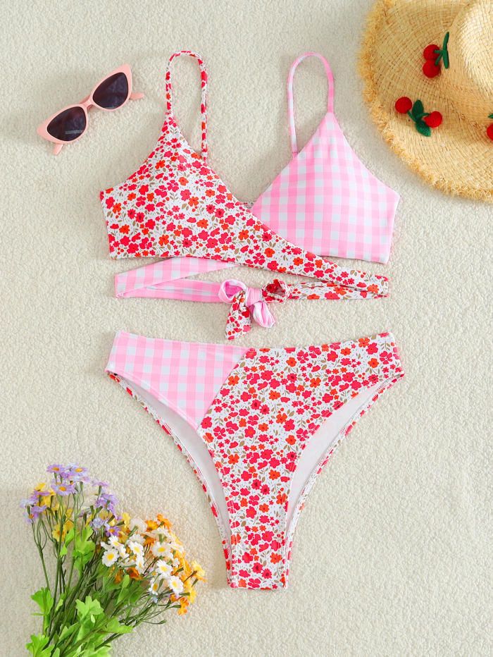 (Real Image)2024 Styles Women Printed Color-Blocked Cross-Tied Sexy Bikini SwimsuitSKU: #CF56133-1