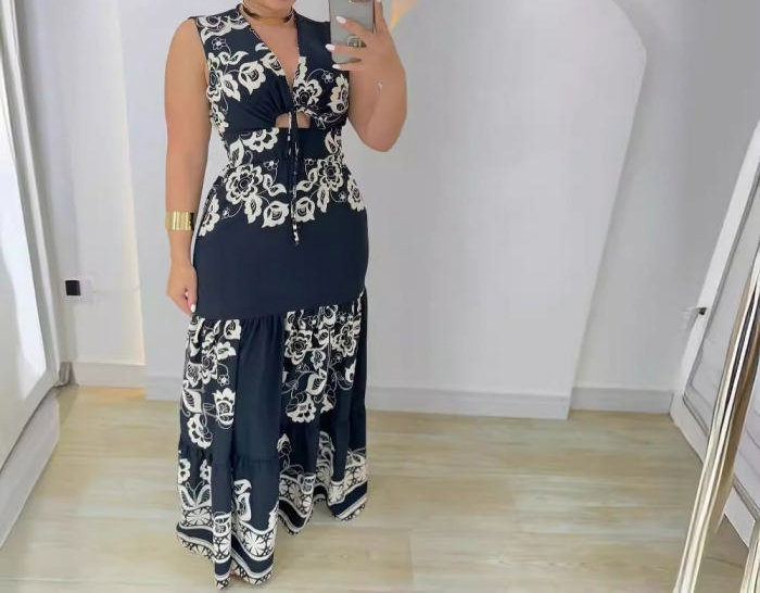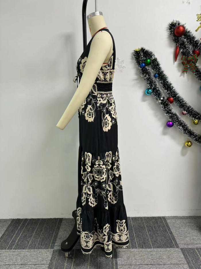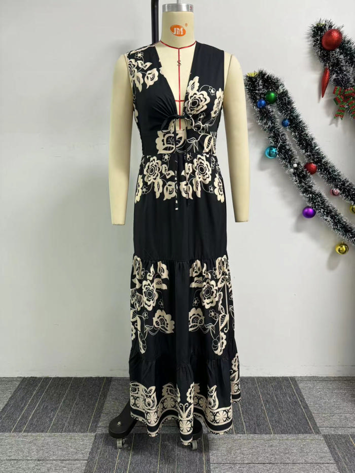 (Real Image)2024 Styles Women Printed Patchwork Lace-up Waist Sheer Sleeveless Gathered DressSKU: #XF27480-1