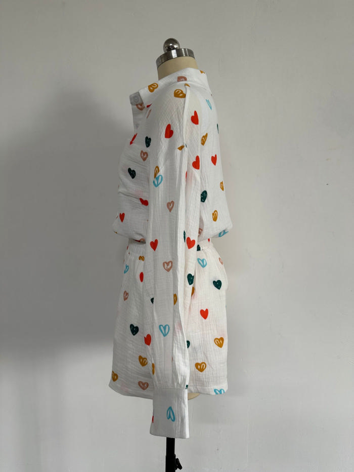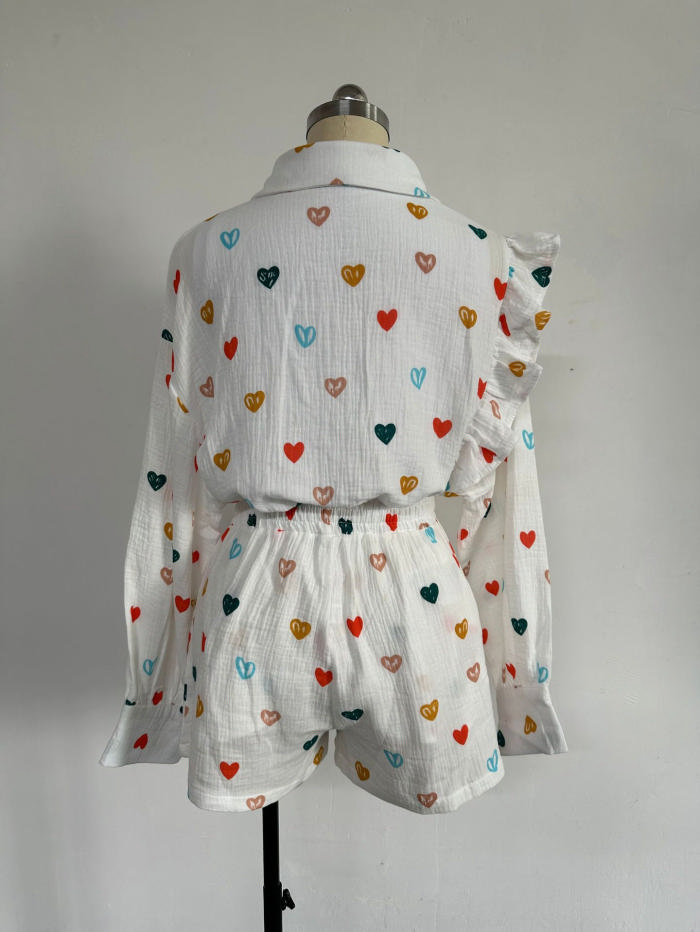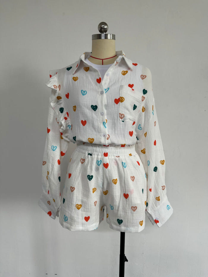 (Real Image)2024 Styles Women Ruffle Heart Print Shirt with Wide-Leg Shorts Casual SetSKU: #CF91048-2