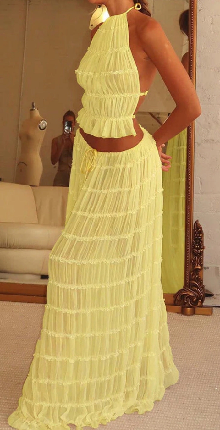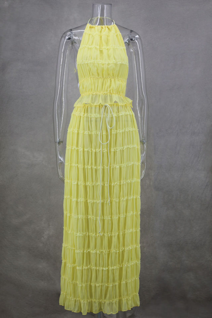 (Real Image)2024 Styles Women Sensational Lace Halter Neck Gown Set with Open Back and RufflesSKU: #OU2964-3