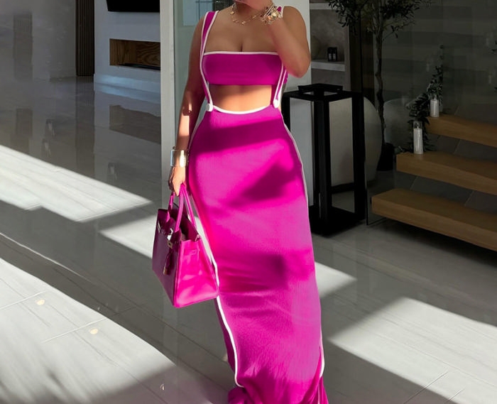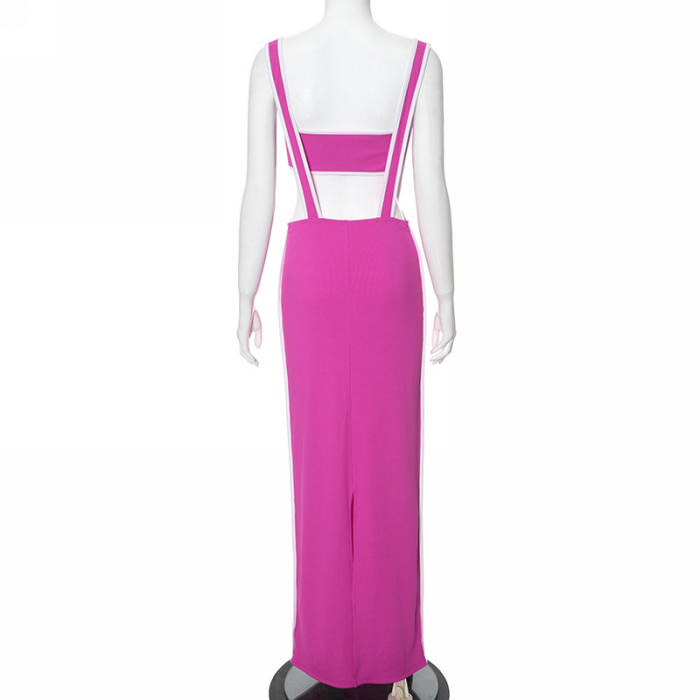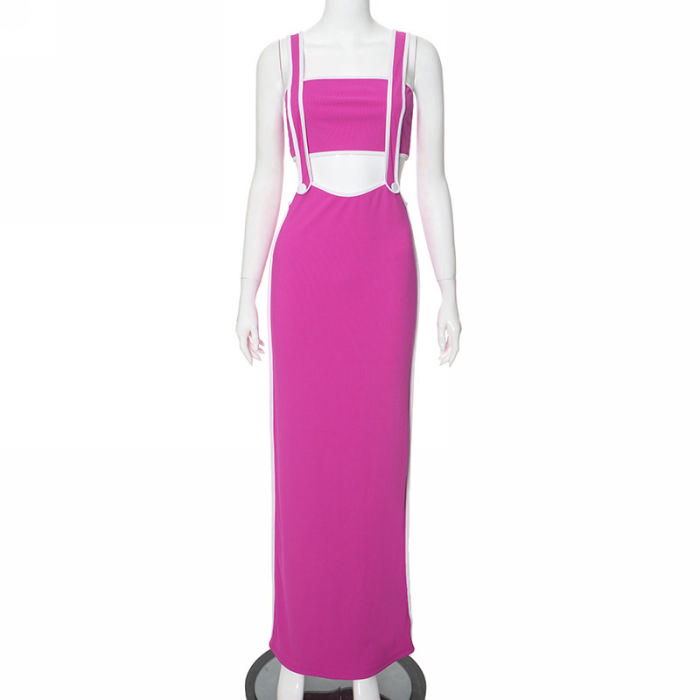 (Real Image)2024 Styles Women Sexy Contrast-Trim Short Top with Suspender Belted Maxi Skirt SetSKU: #CF92044-1