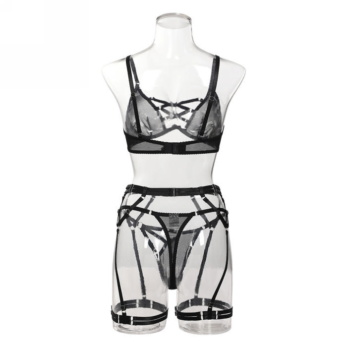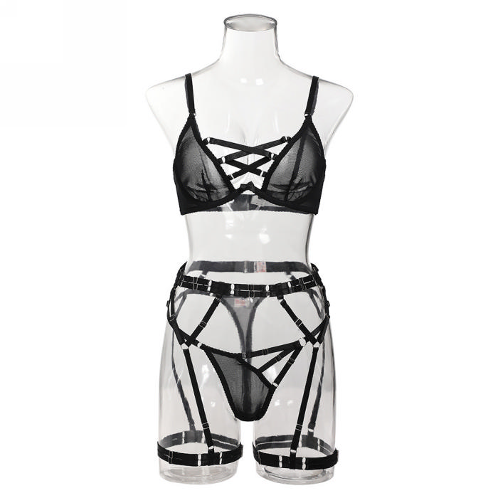 (Real Image)2024 Styles Women Sexy Cross-Over Openwork Lace-Up Sheer Net Mesh Erotic Lingerie SetSKU: #GF02021-2