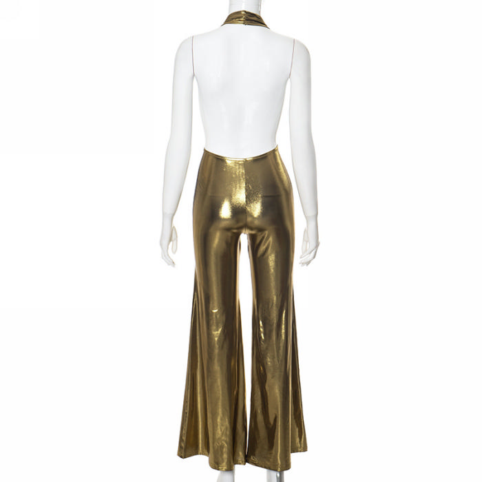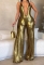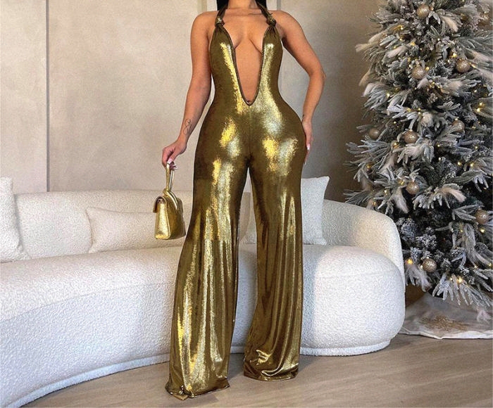 (Real Image)2024 Styles Women Sexy&Fashion Sprint/Summer TikTok&Instagram Styles Backless Golden Deep V Neck Halter JumpsuitSKU: #CF92004-1