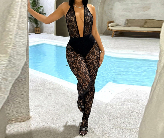 (Real Image)2024 Styles Women Sexy&Fashion Sprint/Summer TikTok&Instagram Styles Lace Deep V Neck JumpsuitSKU: #CF92034-1