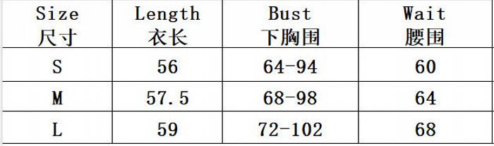 | Size | Bust | Waist | Hips |