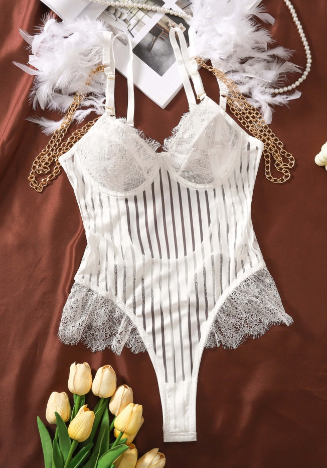 (Real Image)2024 Styles Women Sexy Lace Padded with Striped Net Mesh U-Back Feather Shapewear Erotic BodysuitSKU: #GF02017-3
