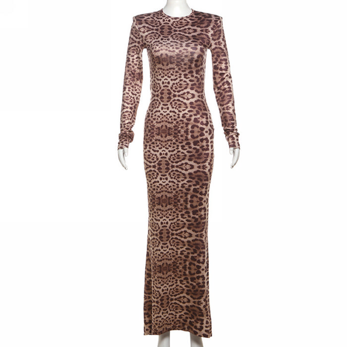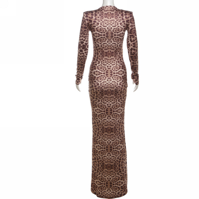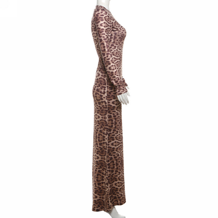 (Real Image)2024 Styles Women Sexy Leopard Print Round Neck Long Sleeve Bodycon Pencil Maxi DressSKU: #CF12408-1