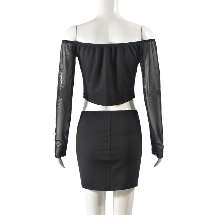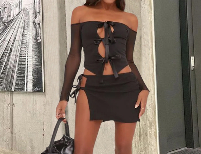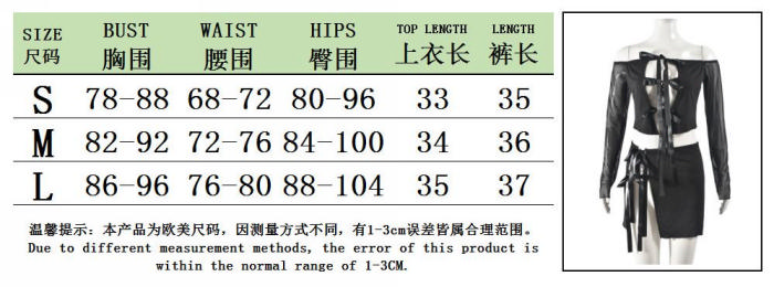 (Real Image)2024 Styles Women Sexy Open-Work Off-Shoulder Tie-Up Top and Skirt SetSKU: #CF59879-1
