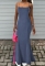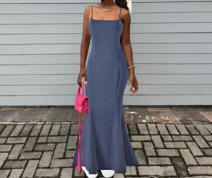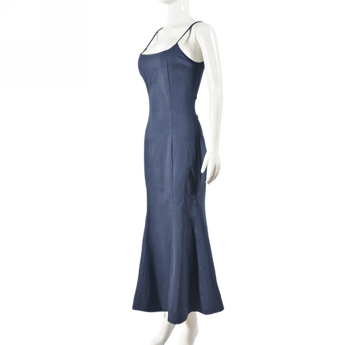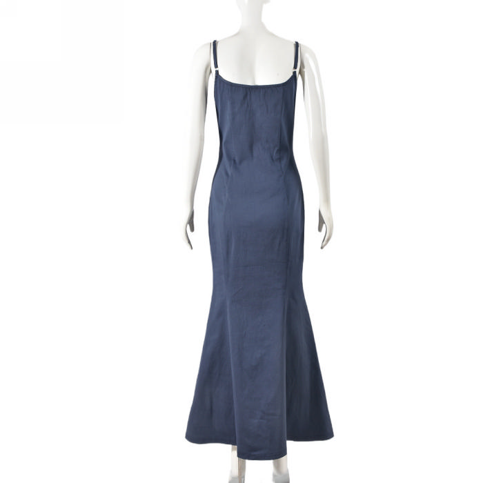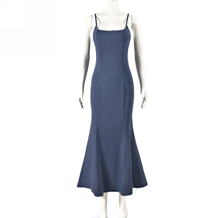 (Real Image)2024 Styles Women Sexy Open-Work Open Back Stretch Denim Long Halter Maxi DressSKU: #CF59880-1