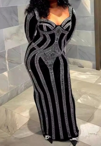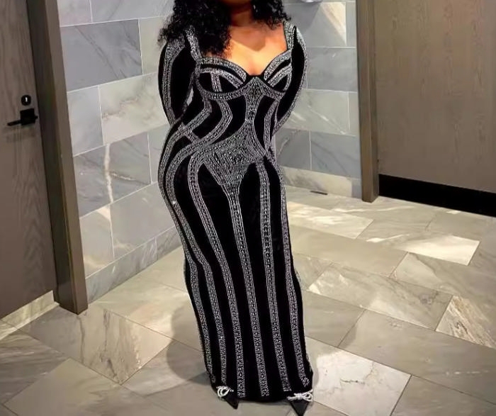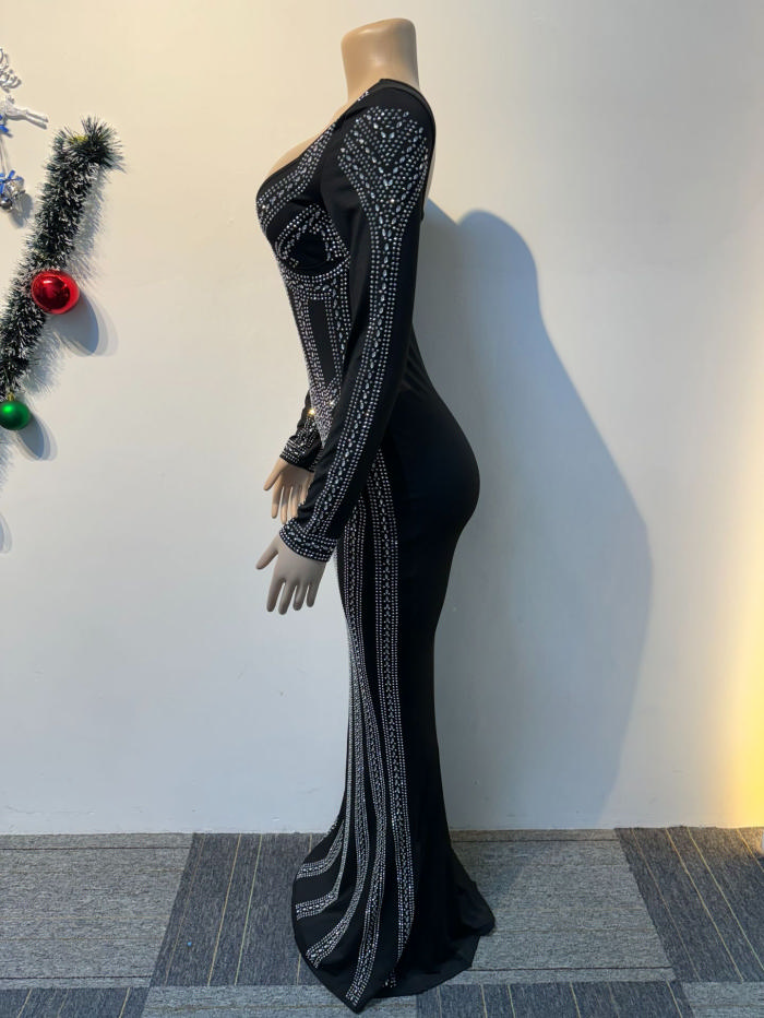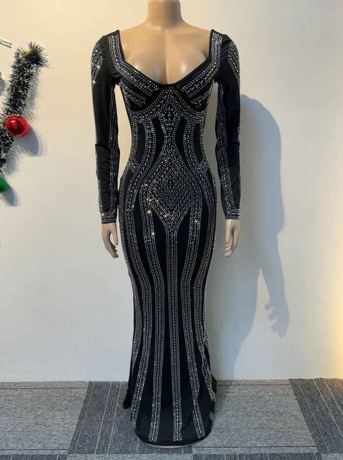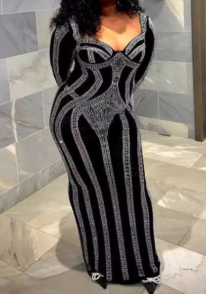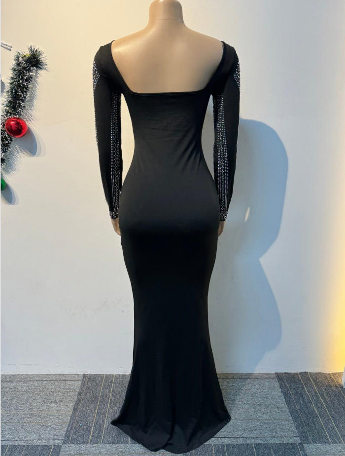 (Real Image)2024 Styles Women Sexy Sequin-Embellished Square Neck Bodycon Long Flared DressSKU: #XF27505-1