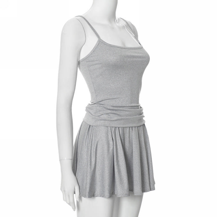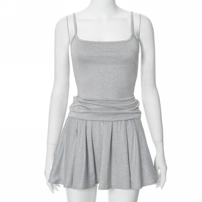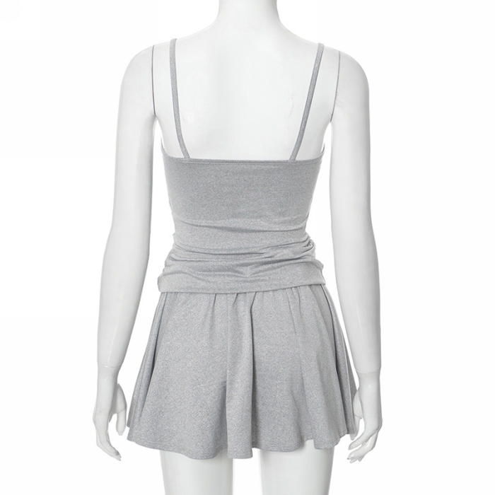 (Real Image)2024 Styles Women Solid Color Halter Vest Short Sleeve Top with Flared Waist Skirt Two-Piece SetSKU: #CF42049-1