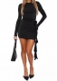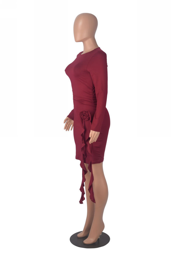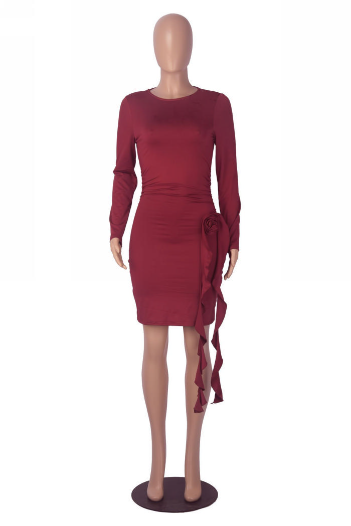 (Real Image)2024 Styles Women Solid Color Long-Sleeve Round-Neck Slim Fit Dress with Rose Print and Fluttering RibbonsSKU: #XF01008-2