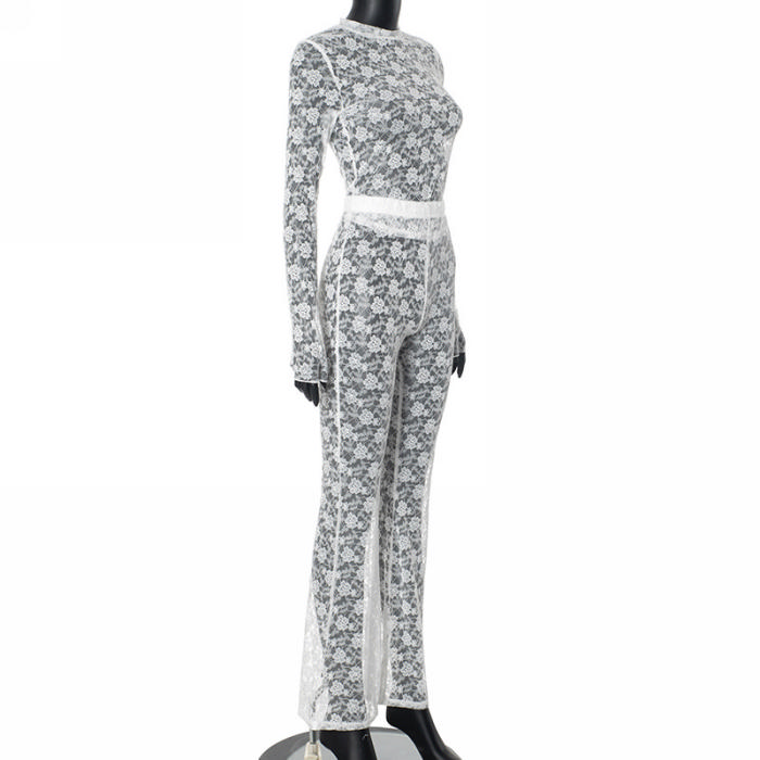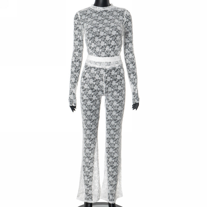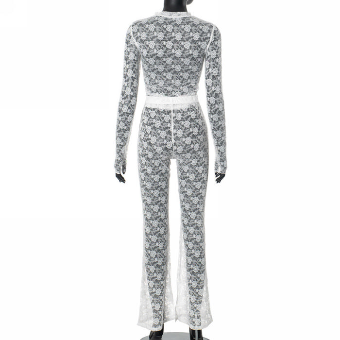(Real Image)2024 Styles Women Solid Color Sexy Lace See-Through Long Sleeve Mid-Length SetSKU: #CF42080-1