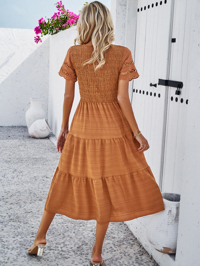 (Real Image)2024 Styles Women Spring/Summer Solid Color Elegant Gathered Openwork DressSKU: #XF45061-5