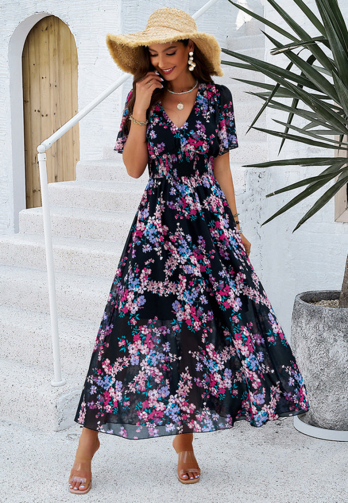 (Real Image)2024 Styles Women Spring/Summer Stylish Floral Print Waist-Cinch Short Sleeve Maxi DressSKU: #XF45067-1