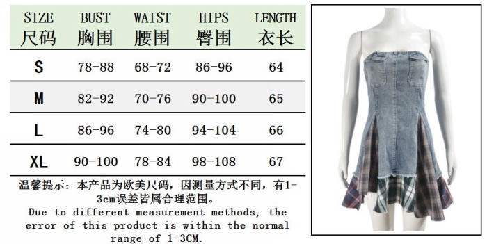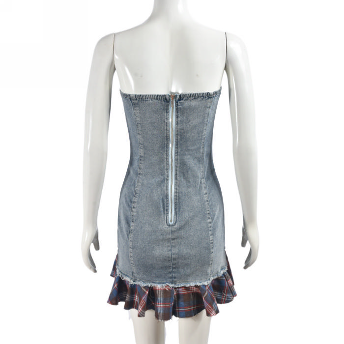 (Real Image)2024 Styles Women Stretch Denim Bandeau Colorblock Plaid DressSKU: #CF59913-1