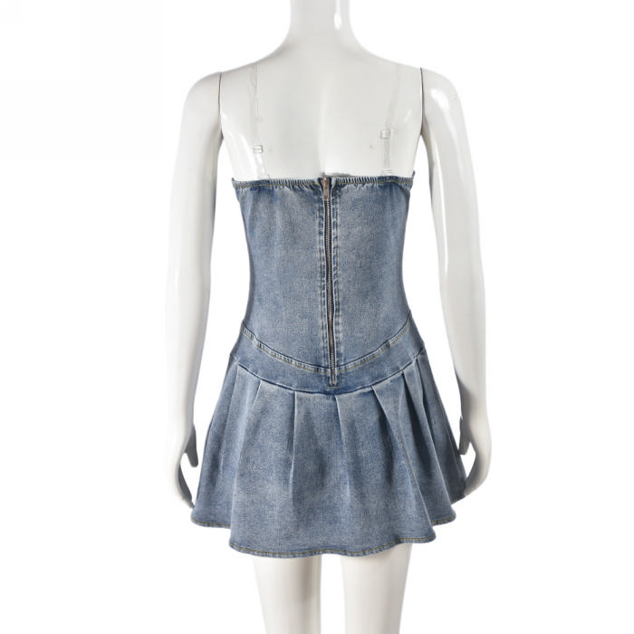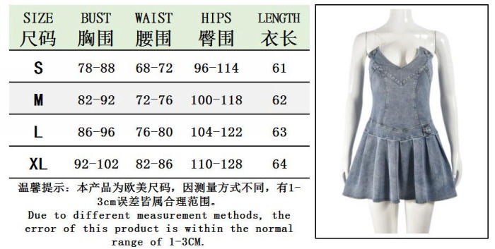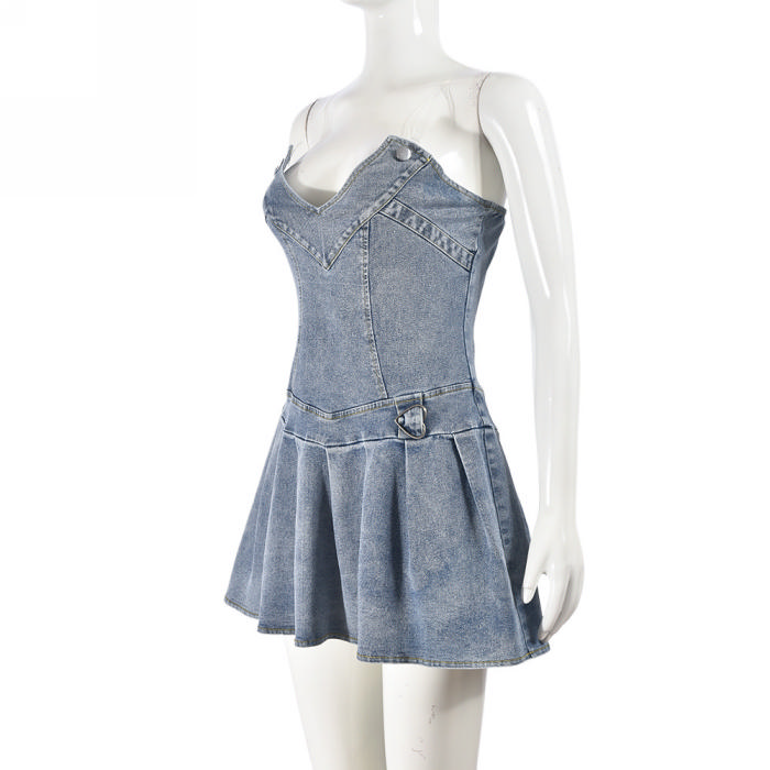 (Real Image)2024 Styles Women Stretch Denim Women's Halter Sexy French Pleated V-Neck DressSKU: #CF59862-1
