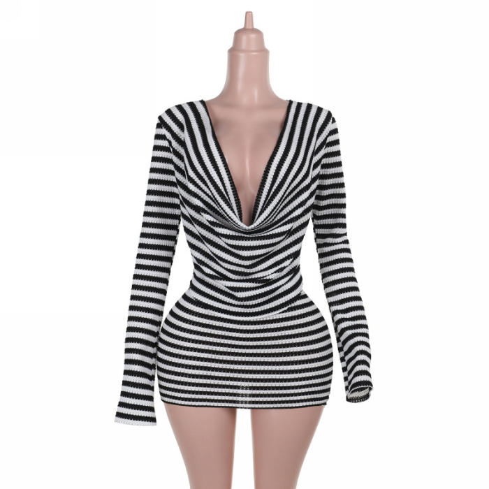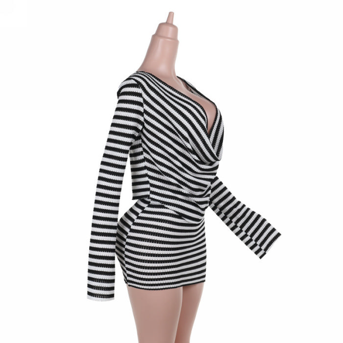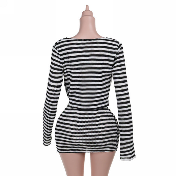 (Real Image)2024 Styles Women Stripe Knit Swing Collar Long-Sleeve Skirt SetSKU: #XF92984-1