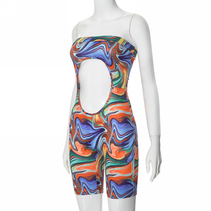 (Real Image)2024 Styles Women Stylish Colorful Print Halter Lace-Up Sleeveless JumpshortsSKU: #CF92137-1
