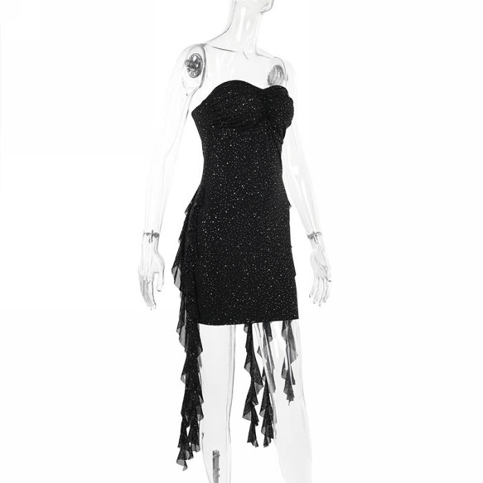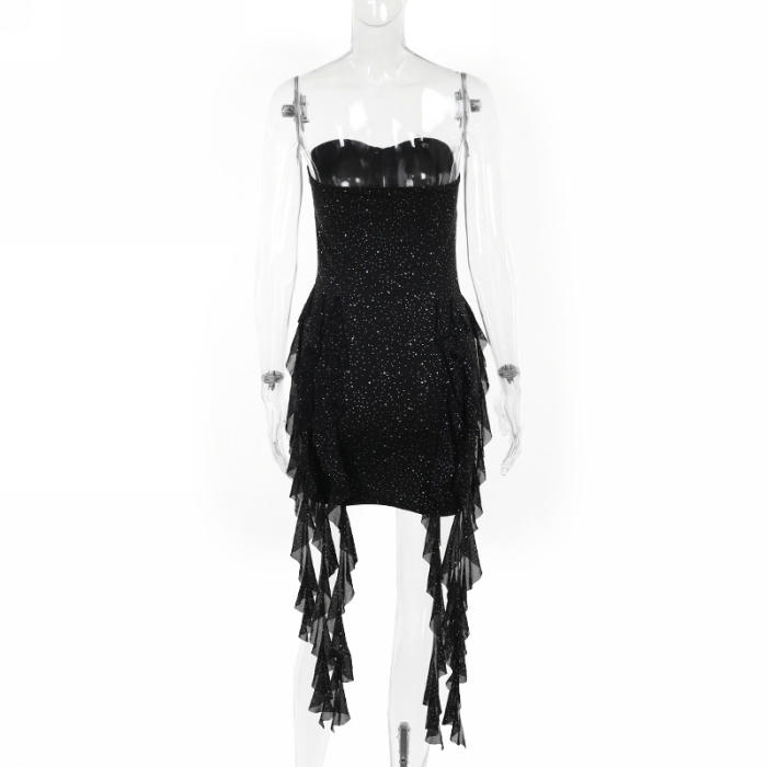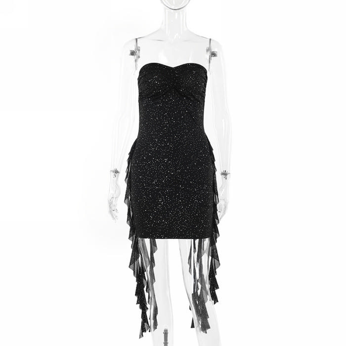 (Real Image)2024 Styles Women Sultry Glittering Mesh Halter Neck Ribbon-Belt DressSKU: #XF92903-1