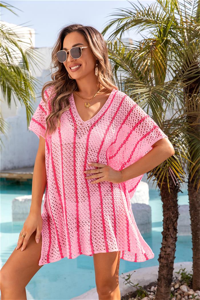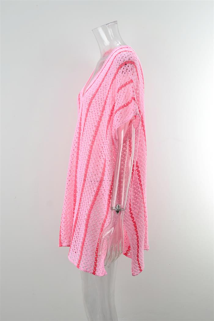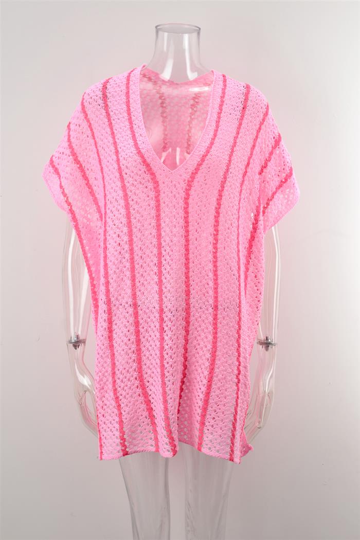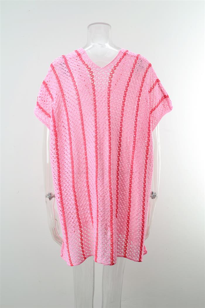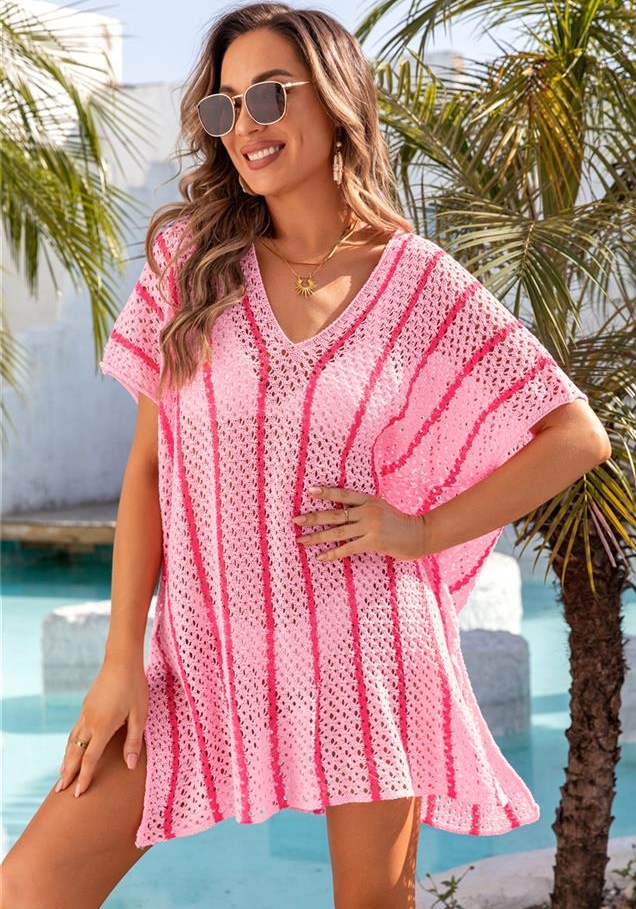 (Real Image)2024 Styles Women Summer Beach Knitted Sun Protection Clothing Bikini Vacation Dress Plus Size Loose Color Block Cover UpSKU: #GF01012-3