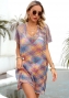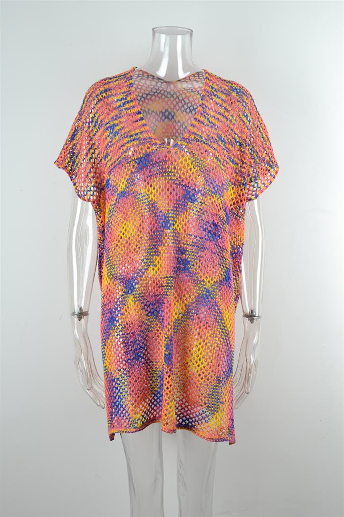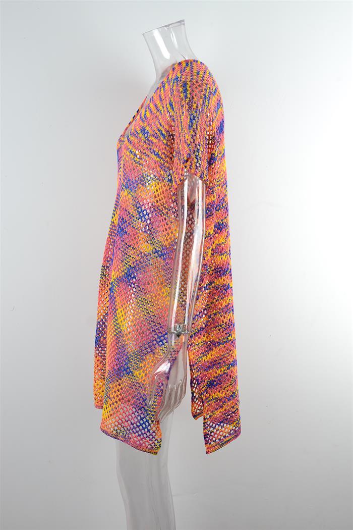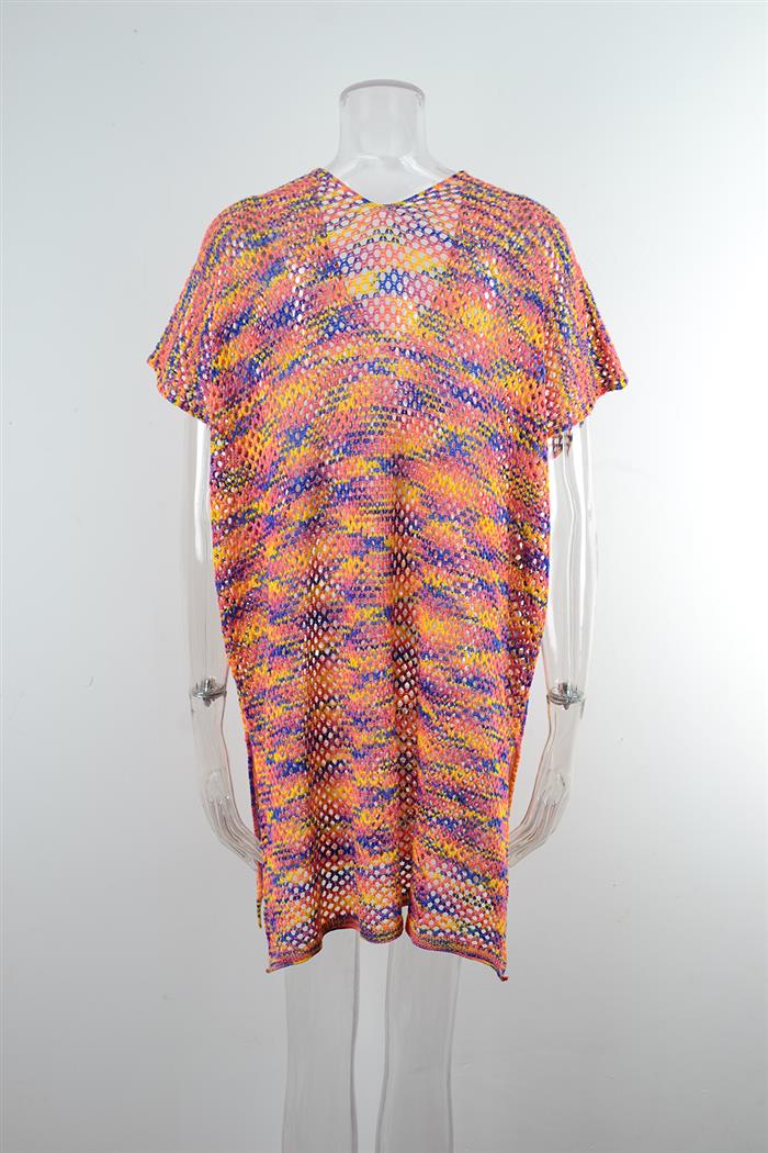 (Real Image)2024 Styles Women Summer Cover Up Rainbow Splicing Hollow Loose Bikini Beach Cardigan Knitted CardiganSKU: #GF01010-4