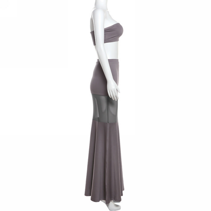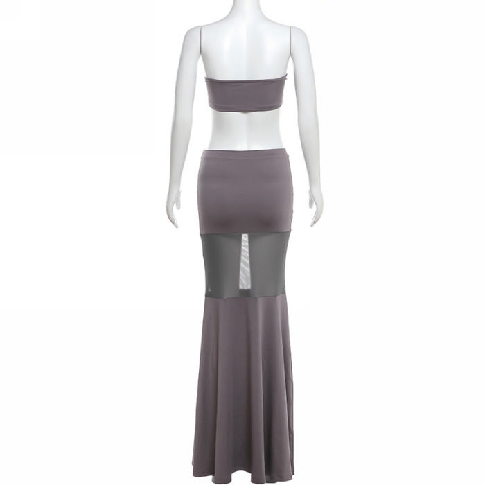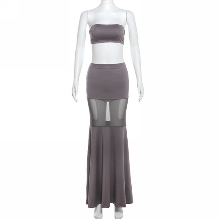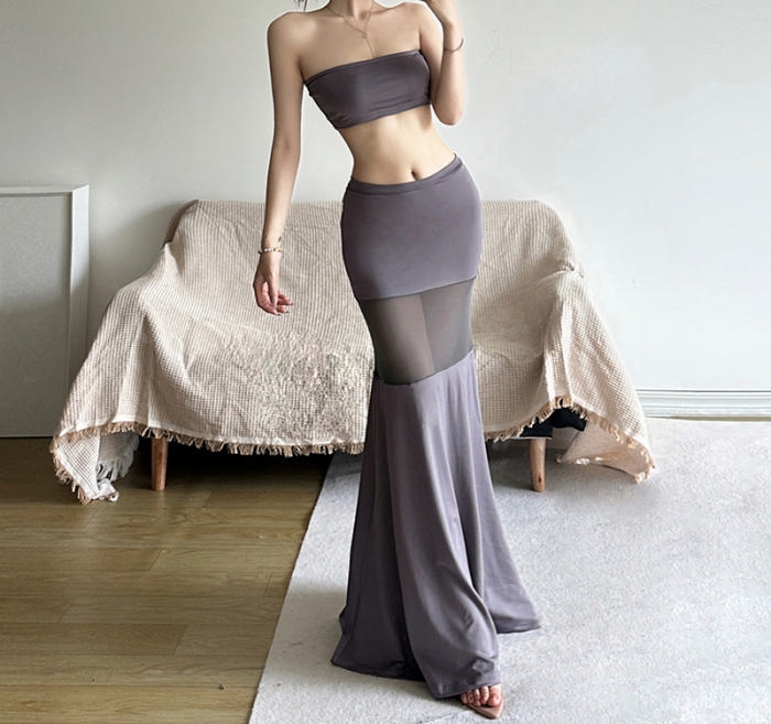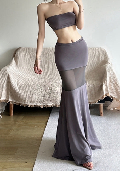 (Real Image)2024 Styles Women Summer Crop Top Bandeau with High Waist Sheer Slimming Mermaid Skirt SetSKU: #CF77794-1