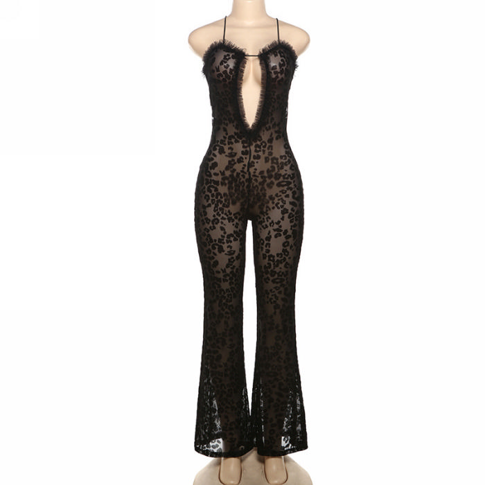(Real Image)2024 Styles Women Summer Fashion Backless Sheer Mesh Leopard Print JumpsuitSKU: #CF77777-1