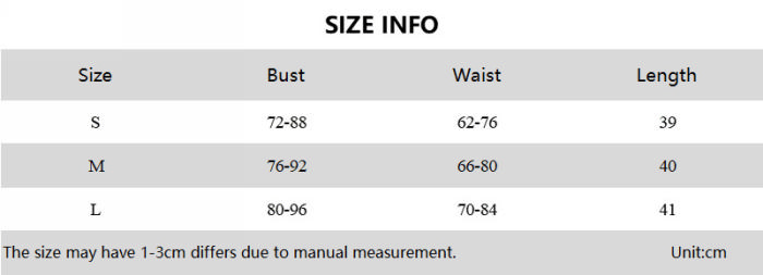| Size | Bust | Waist | Hips |