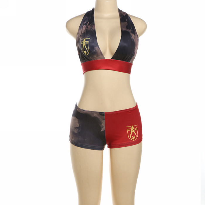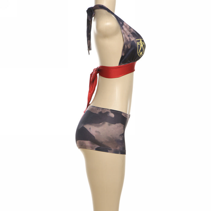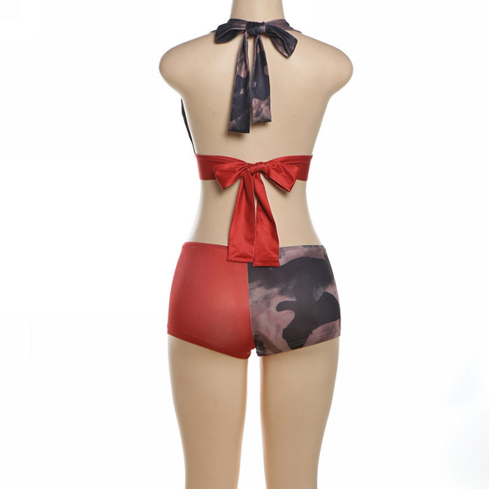 (Real Image)2024 Styles Women Summer Fashion Halter Neck Lace-up Backless Top with High Waist Butt-Lift Floral Print Shorts SetSKU: #CF77784-1
